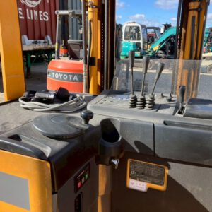 Thiết kế siêu linh hoạt: Với kiểu dáng đứng lái nhỏ gọn, xe có thể xoay xở dễ dàng trong lối đi chỉ từ 2.3m – 2.5m. Khung nâng FSV (3 lao) cho phép xe nâng cao đến 4.5m nhưng khi hạ xuống lại rất gọn, dễ dàng chui qua các cửa kho thấp.